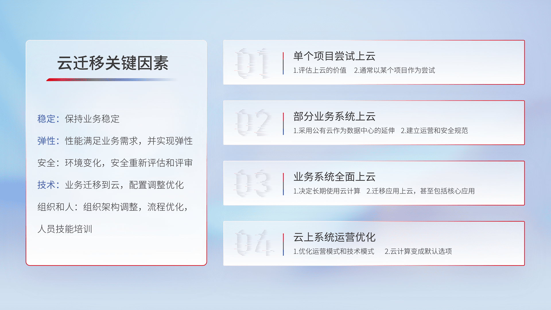 结合实际业务,,从规划设计、、云平台选型、、、云原生改造、、、、数据迁移、、集成交付,,,,迁移全过程为客户识别最佳上云路径,,,做好风险识别管理,,设计网络架构、、、、身份权限、、安全审计合规、、、操作审计、、、日志审计、、、监控告警策略、、多站点容灾设计等,,,,对云上基础设施进行整体规划,,,提升IT治理水平,,以满足弹性、、、、高可用、、、高性能的需求。。。。