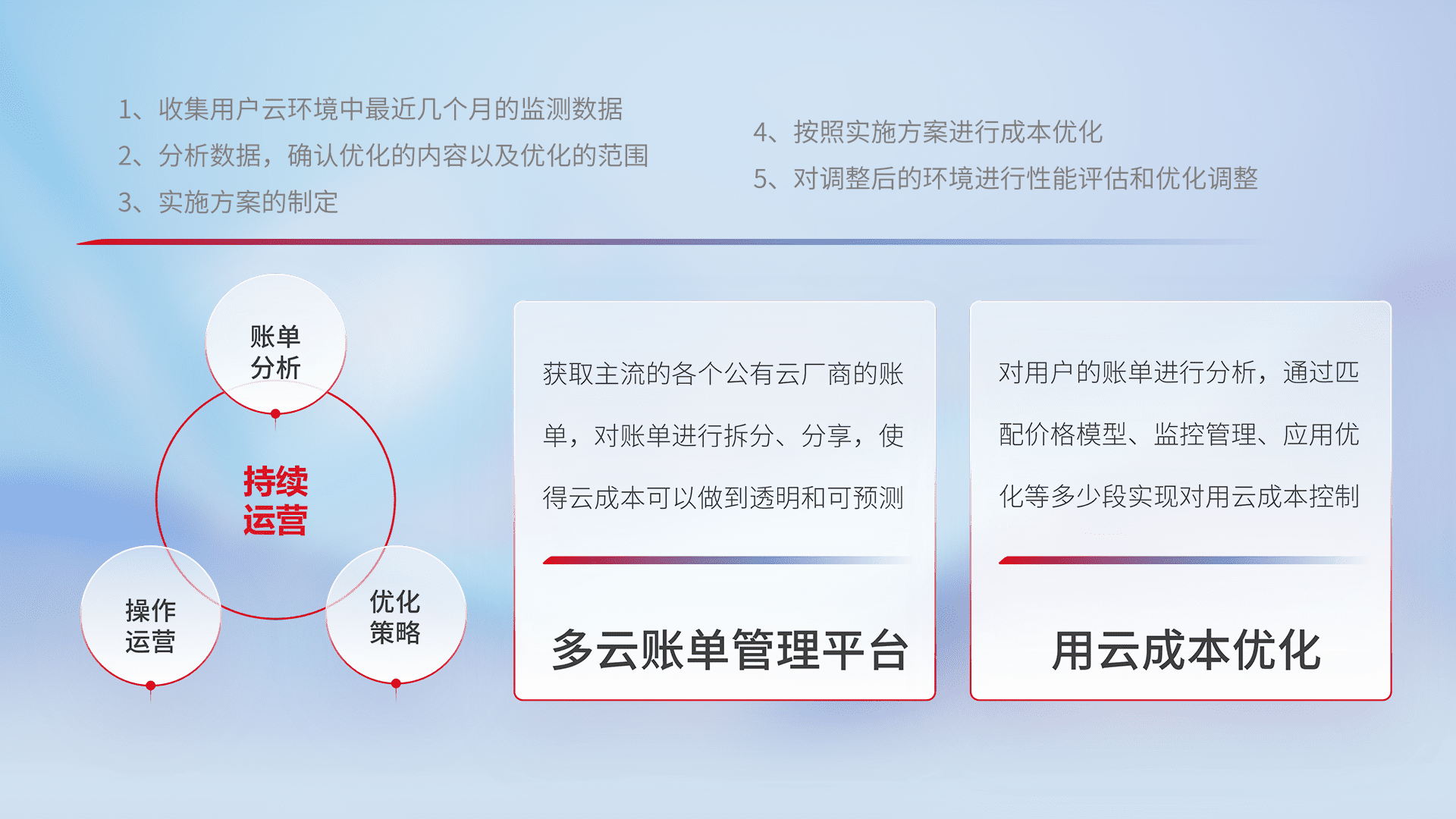 通过多云纳管,,,以统一的资源数据模型把客户的云资源进行抽象和封装,,,进而实现对多云资源的统一操作,,,保障云资源管理的可靠性、、、、稳定性与可用性。。量身定制化运维内容,,,,配置、、、、开发运维、、补丁管理、、、、备份、、监控、、、认证和访问管理、、审计和日常巡检等,,保障在用云过程中的可靠度,,,,稳定度以及高可用率。。。